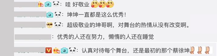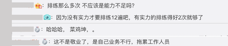 有一派的網友認為,正常藝人彩排的次數不會需要用到5個小時、12次的演練,紛紛留言表示:「這不是敬業了,是自己業務不行,拖累工作人員」、「排練那麼多次 不應該是能力不足嗎?」、「因為沒有實力才要排練12遍吧,有實力的排練得好2次就夠了」,另一派的人則表示這是敬業的精神,並不是每個藝人都能夠保有的,寫下:「認真對待每個舞台,還是最初的那個蔡徐坤」、「優秀的人還在努力,懶惰的人還在睡覺」,引發熱議。