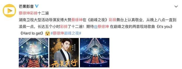 蔡徐坤自去年以NINE PERCENT團員的身份出道後,所到之處都成為焦點,更是現今大陸流量男神,而他也在5月30日時,參加湖南衛視的大型節目《巔峰之夜》,並演出兩首歌曲《it’s you》、《Hard to get》,然而在正式演出之前,蔡徐坤一路從晚上8點彩排到凌晨1點,總共演練了12次。相當驚人的彩排次數也引起網友正反兩極的評價。