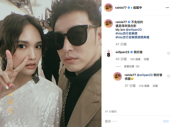然而楊丞琳和潘瑋柏是演藝圈中公認感情相當好的朋友,兩人也時常在IG上鬥嘴,這次兩人都受邀參加Hito流行音樂獎頒獎典禮,楊丞琳也表示在後台有遇見潘瑋柏,更搞笑的表示不知道潘瑋柏有沒有變胖,「但沒有變瘦就是了」。而潘瑋柏在受訪時也回應關於楊丞琳說他變胖的事,表示:「她(楊丞琳)對我來說沒有什麼好話的」,相當搞笑。