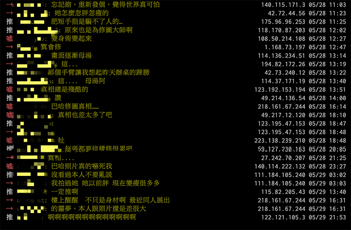 也有人貼上過去有網友在論壇巴哈姆特整理的照片,只見其中放了許多落落的「未修圖」照片,還有一張直播時的截圖,畫面中可以清楚看到落落臉部圓潤許多,雙下巴微微現形,就連手臂和腿部都和修過的照片有明顯落差,對比照出爐讓網友乍看險些認不出來。
