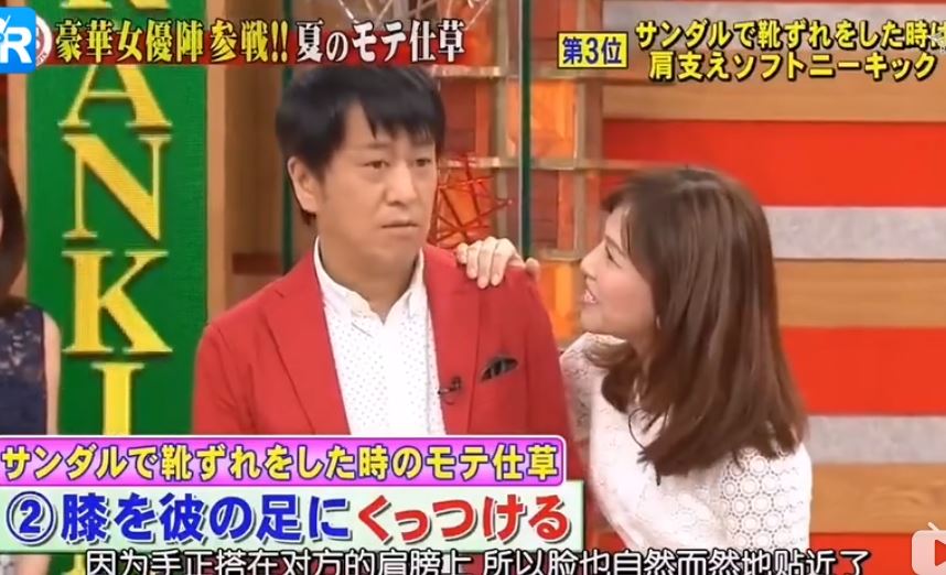 日本女星橋本環奈為戲現身綜藝節目,而節目中也教導撩人技巧,並設下情境「腳後跟被磨時的撩人小動作」。節目中,示範老師拆解步驟教導,先是一邊對走在前面的人說「稍等一下」,一邊自然地把手搭在他肩上,隨後小聲抱怨「好痛喔」邊抬起受傷的那隻腳並輕輕貼到對方腿上,老師也補充說到這個做法有兩種目的,包括可以單腳站穩,也可以在喊痛的同時臉也自然貼近,製造出怦然心動的感覺,不過一旁示範的男星卻玩笑表示「胸部也會靠在自己的手臂上」、「覺得老師的海綿好像墊的有點多」。