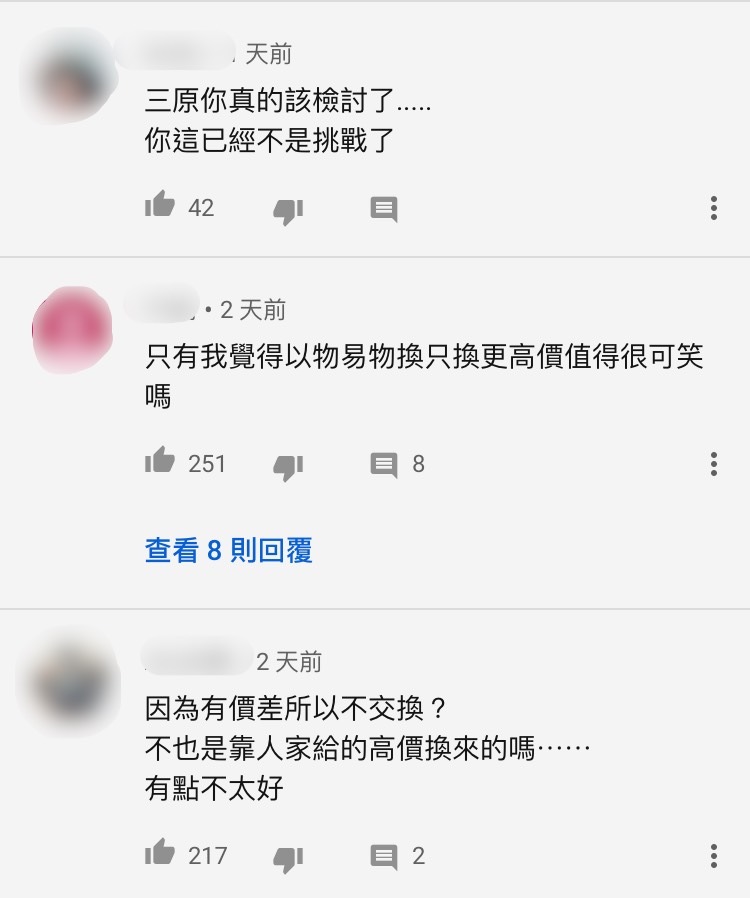 影片出來後,網友在留言區罵翻:「只有我覺得以物易物只換更高價值很可笑嗎」、「因為有價差所以不交換?」、「換就換還在那邊換比較好的東西 很沒禮貌」,認為三原只換高價物品給人感覺很不好,而且以物易物也失去了1元度過一餐的意義。