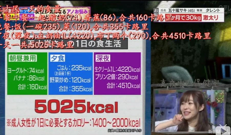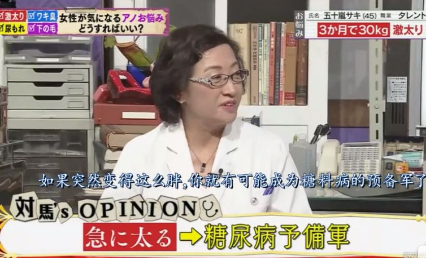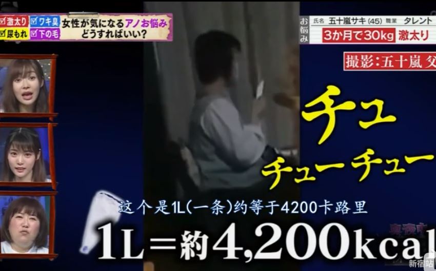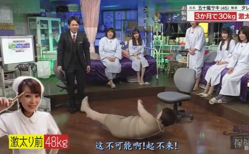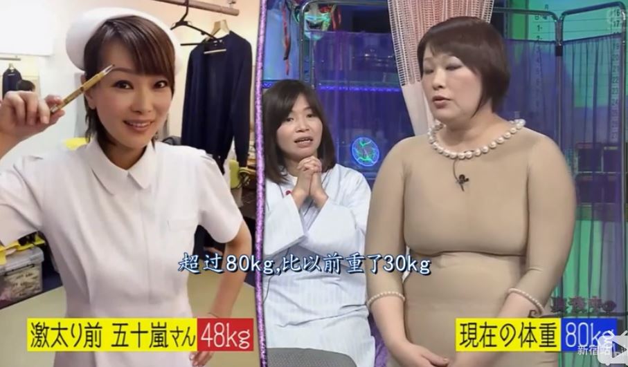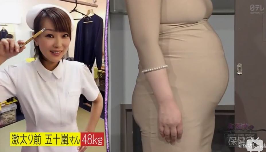 5月播出的日綜《真夜中の保健室4》中,邀請一名現年已45歲的女演員五十嵐サキ上節目,然而久未現身的他,卻在3個月內爆增30多公斤,目前體重已經跨越80公斤大關。當天身穿肉胎裝的五十嵐,完全難掩肥胖的小腹和粗壯的四肢,他也公開爆食理由,表示隨著年紀變大無法勝任漂亮的女主角 去年又被未婚夫甩,讓他開始心情抑鬱而暴飲暴食。