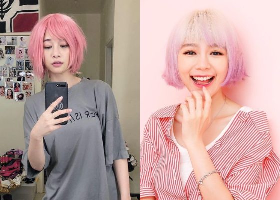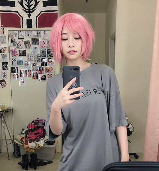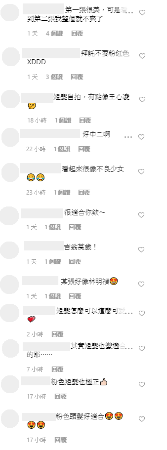 千千也在第二張照片中放上戴上假髮的自拍照,雖然只是一般的寬鬆T恤,不過頭上的粉色仍相當搶眼,搭配她迷濛的表情,乍看之下也有點像是大馬女神林明禎,網友紛紛留言:「第三張自拍好美」、「拜託不要粉紅色XDDD」、「第三张好漂亮!!!」、「看起來很像不良少女」、「好像林明禎」、「短髮怎麼可以這麼可愛」,此外也有網友認為有點像徐若瑄、王心凌。