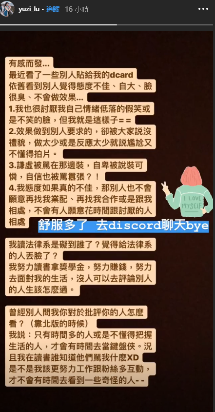 另一方面,路路也說道:「我讀法律系是礙到誰了?覺得給法律系的人丟臉了?我努力讀書拿獎學金,努力賺錢,努力面對我的生活,沒人可以去評論別人的人生」,她強調只有時間多的人或是不懂得把握生活的人,才會有時間去當鍵盤俠,「況且我在讀書誰知道他們罵我什麼」。