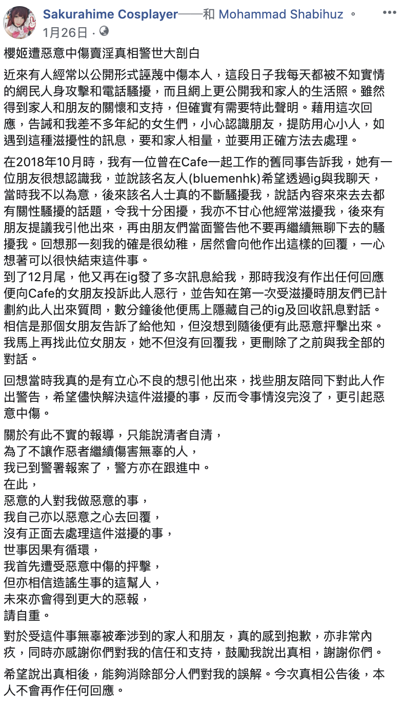 然而被網友爆出這些不堪的訊息之後,櫻姬也在個人臉書發文澄清:「近來有人經常以公開形式誣蔑中傷本人,這段日子我每天都被不知實情的網民人身攻擊和電話騷擾」,並提到她以前在一家咖啡廳的同事說有人想認識她,才交換了聯絡資訊,表示:「當時我不以為意,後來該名人士真的不斷騷擾我,說話內容來來去去都有關性騷擾的話題,令我十分困擾」,也表示已經報案。然而在這篇澄清貼文之後,櫻姬就不曾再使用臉書發文了。