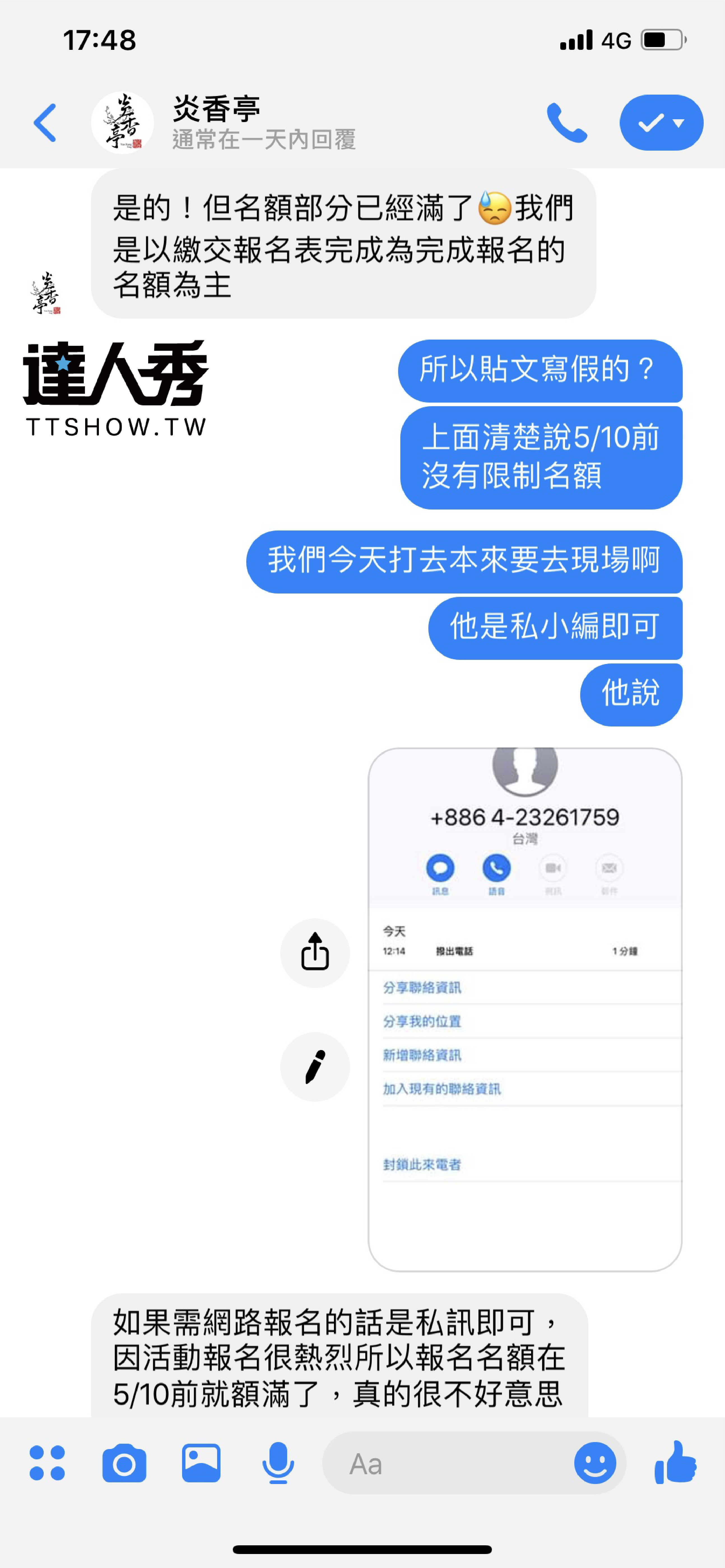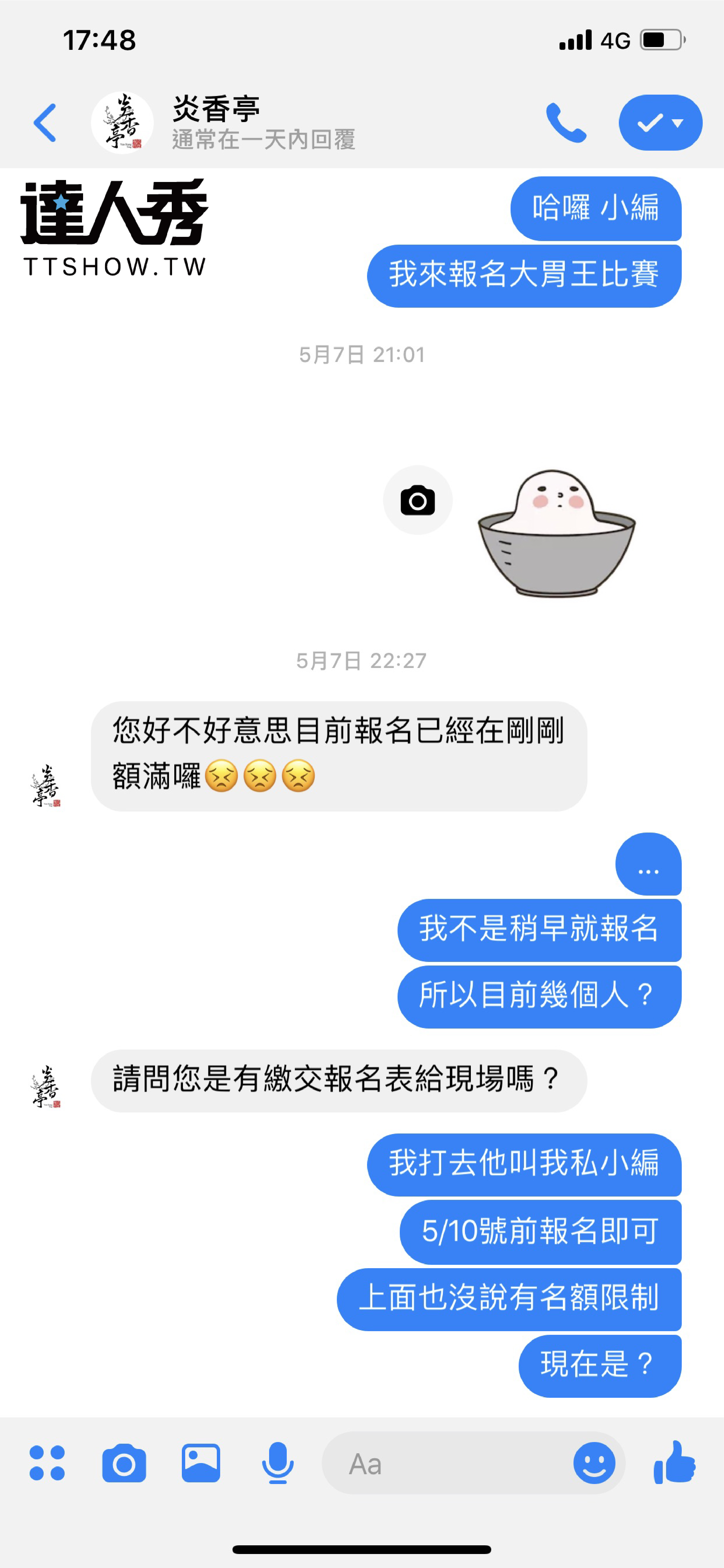 而針對網友的質疑,丁丁也公開了和店家的對話截圖,原來比賽的報名截止日是5月10日,他於7日中午打電話給店家報名,當時店家告知私訊小編即可,怎料當日晚上他私訊店家粉專時,店家卻回應:「報名已經在剛剛額滿囉」。因為起初店家的比賽公告上,並未提及人數限制,他也在期限內報名卻沒報成功,才讓他們略感不滿。丁丁坦言當時因為幫他報名的小幫手求好心切,才會激動和店家提到:「想上爆料公社?」不過基本上他們完全依照店家的報名辦法,並不是強詞奪理。