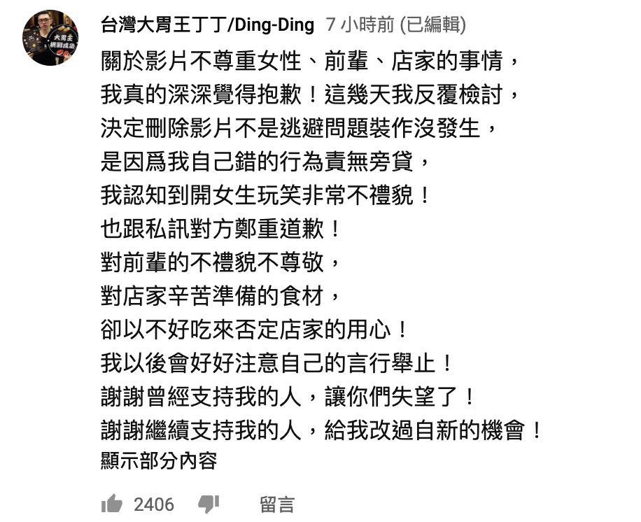 對此丁丁今下午再度透過YouTube道歉:「關於影片不尊重女性、前輩、店家的事情, 我真的深深覺得抱歉!」提到自己已經認知到錯誤,「決定刪除影片不是逃避問題裝作沒發生, 是因爲我自己錯的行為責無旁貸」,他透露自己已經與「都給涵涵吃」道歉,其他錯誤也已經深刻反省,希望大家再給他改過自新的機會!此外他也透過《台灣達人秀》回應:「我沒有驕傲認為自己了不起,我分享大胃王比賽經驗給觀眾,說要有自己節奏配速,不要一開始猛衝」。