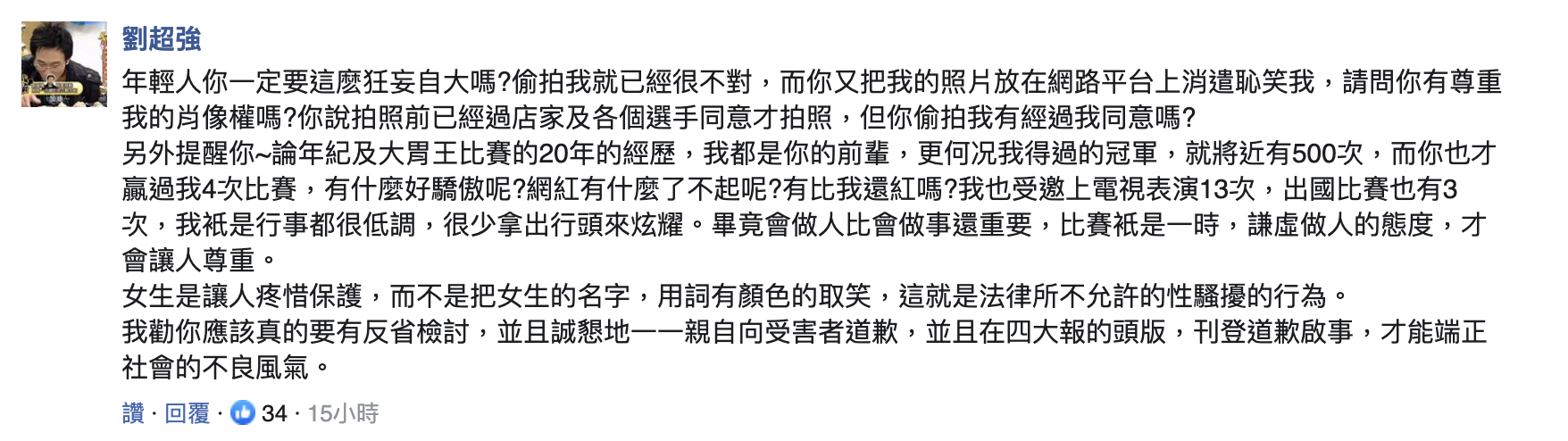 事實上除了網友留言抨擊之外,影片中的苦主劉超強,也在《台灣達人秀》新聞下方留言:「偷拍我就已經很不對,而你又把我的照片放在網路平台上消遣恥笑我,請問你有尊重我的肖像權嗎?你說拍照前已經過店家及各個選手同意才拍照,但你偷拍我有經過我同意嗎?」質問丁丁。還強調自己是丁丁的前輩,訓勉他:「比賽只是一時,謙虛做人的態度,才會讓人尊重。」