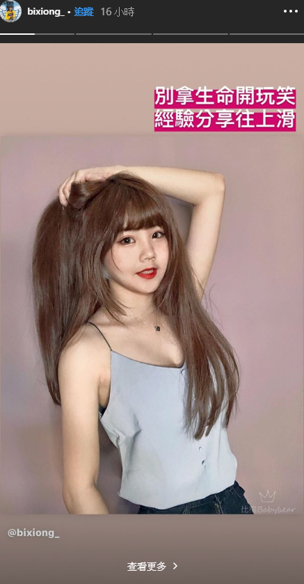 比熊,本名陳又禎,是網紅團體「在不瘋狂就等死」的一員,因為可愛的外型加上性感的身材累積許多粉絲,同時她也有經營在不瘋狂的子頻道「尬酒螺仔」、「熊性本色」、「其他人」,自然又幽默的拍片風格也讓她的頻道快速成長,IG也已經累積7萬人次追蹤。而今日比熊在限時動態中分享自己去喬骨頭的故事,更警醒大家:「別拿生命開玩笑」。