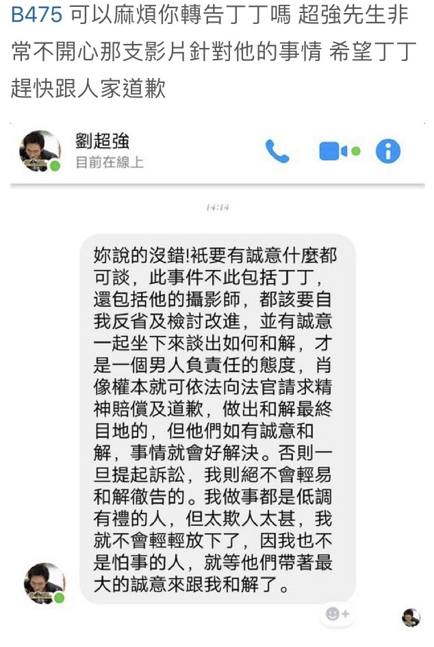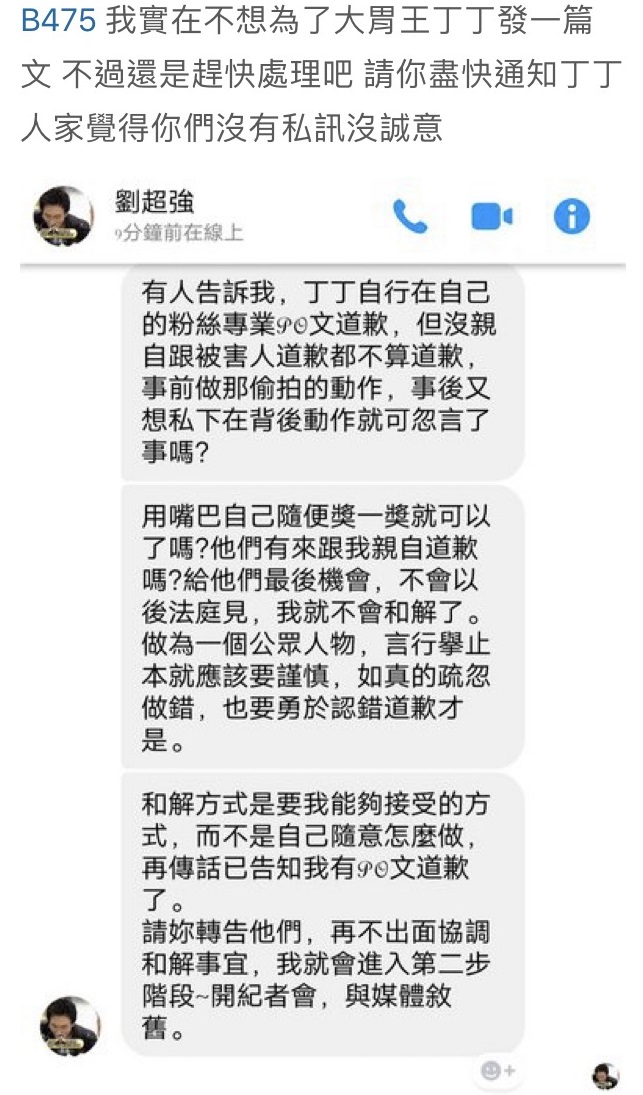 劉超強先是透過Dcard網友回應:「沒親自跟被害人道歉都不算道歉,事前偷拍,事後又想私下動作就可以敷衍了事了嗎?」更表示:「再不出面協調和解事宜,我就會進入第二階段,開記者會」,強調如果丁丁有主動聯繫他,並且釋出誠意,事情就會好解決,「否則一旦提起訴訟,我絕不會輕易和解撤告的」。