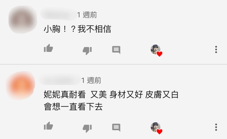 影片出來後,不少網友在下面留言表示:「明明就很大啊!」、「身材剛剛好啦 !沒有多小我覺得」、「小胸?!我不相信」認為妮妮身材其實相當好,不管怎麼穿都好看。