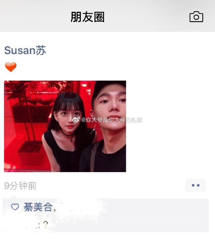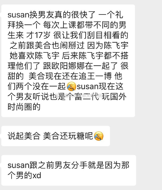 昨日有網友在微博上投稿爆料Susan的戀愛狀況,該位網友截圖Susan在朋友圈發的文,她發出一張和一位男生的合照,並附上愛心的表情符號,而該位網友更爆料寫下:「Susan換男友真的很快了,一個禮拜換一個,每次上課都帶不同男生來」,接個更提到Susan曾喜歡演員「陳飛宇」,後來陳飛宇跟歐陽娜娜在一起了,更爆料Susan現在這個男友是個富二代,除了爆出Susan的料也意外的抖出陳飛宇以及歐陽娜娜。