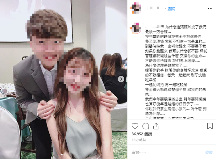 而巫姓男子的正牌女友,正是在IG中有近30萬粉絲的正妹網紅,兩人已經交往8年時間,除了同居之外,也一起經營網拍事業,在社群中常常可以看到兩人放閃的貼文,感情如膠似漆。昨知情後,她也在IG中放上兩人的合照:「為什麼這張照片成了我們最後一張合照....接到電話的時候我完全不相信是你,甚至到現場 我都不相信一切是真的」。