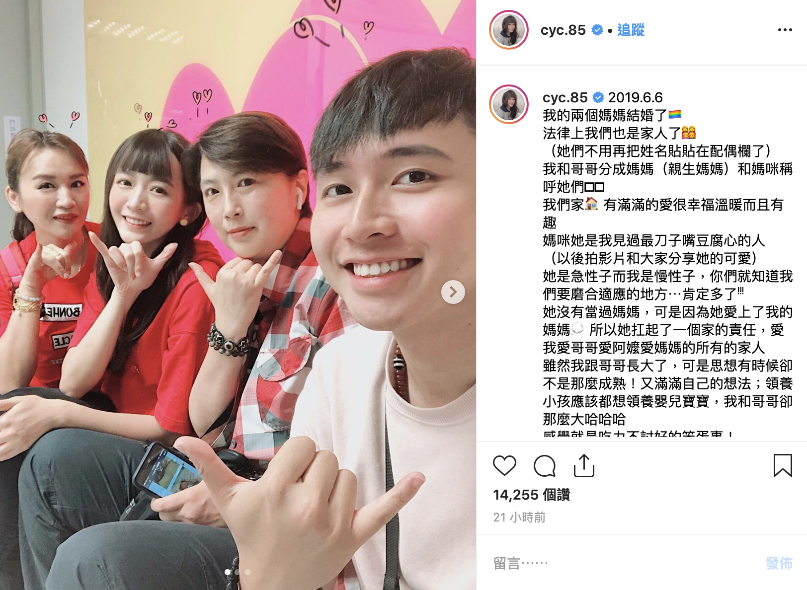 昨(6)日陳語謙在IG中發文:「今天家有囍事,大家猜猜」,後來也終於公布真相「我的兩個媽媽結婚了」讓粉絲又驚又喜!語謙曬出媽媽、媽咪、哥哥和自己的合照,開心宣佈「法律上我們也是家人了,(她們不用再把姓名貼貼在配偶欄了」,照片裡也看得出兩位媽媽的幸福之情。