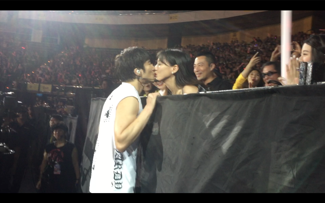 接著黃大煒、陶喆、王偉忠等藝人好友都大方獻上甜蜜的吻!唱到「我唯一愛的就是你」,王力宏放下吉他,移動到坐在第一排的嬌妻李靜蕾面前,踮起腳尖就朝老婆親了下去,全場歌迷再次暴動!