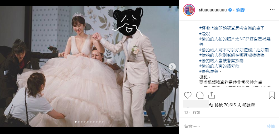 阿福昨也在限時動態中發文:「反正被出賣也不是一天兩天的事,ㄏㄏ」,後來的貼文除了分享結婚當天的心情之外,也在文末打上:「#偷拍的人拍的照片太NG只好自己補幾張 #偷拍的人可不可以好好把照片拍好喇 #偷拍的人你到底躲在哪裡嘛嗚嗚嗚 #偷拍的人會被警察抓喇 #偷拍的人真的很奇欸 #是急屁急」,據悉當日他們還徹查了晚宴賓客名單,不過疑似沒有找到偷拍的人。