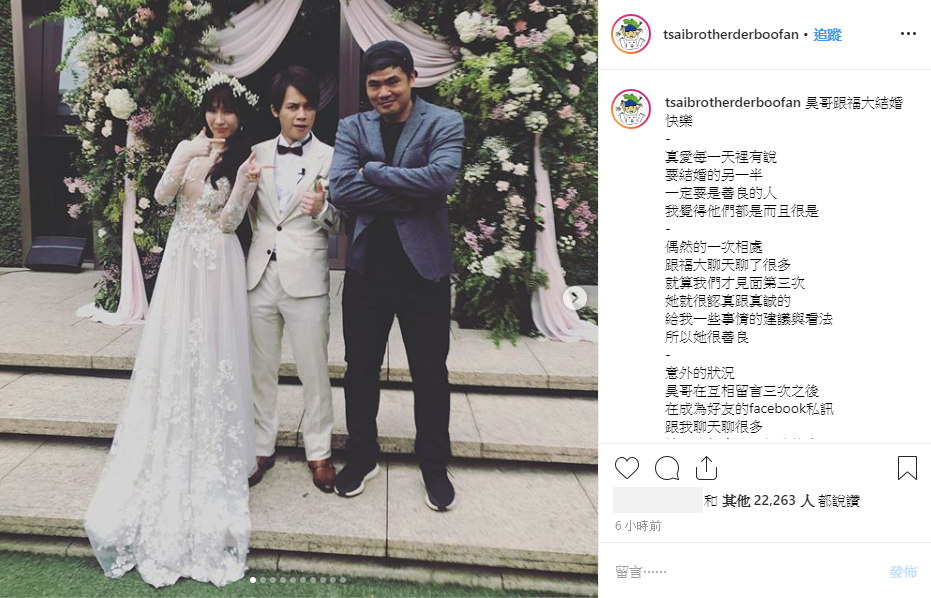 雖然發生讓人不愉快的小插曲,不過兩人結婚還是感動大批粉絲,蔡哥也在今凌晨發文祝福兩人,「昊哥跟福大結婚快樂」,蔡哥透露HowHow和阿福都「很善良」,作為網路創作者的後輩,當初在與二人認識不深的狀態下,HowHow和阿福卻很熱心地提點自己,讓他感動表示:「所以,真的太好了,他們兩個善良的人結婚了,在他們交換誓詞的時候,我笑得很開心,當然有幾個部分是紅了眼眶,甚至是流眼淚了」他也不改自己的作風打上:「How福No.1孩子一大串(單押x1)」。