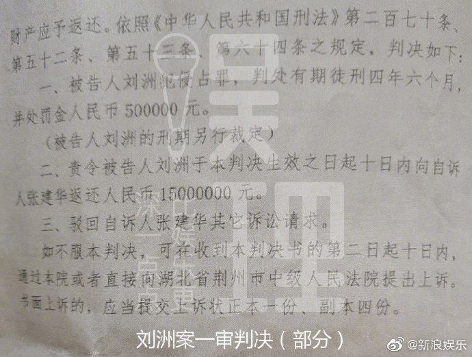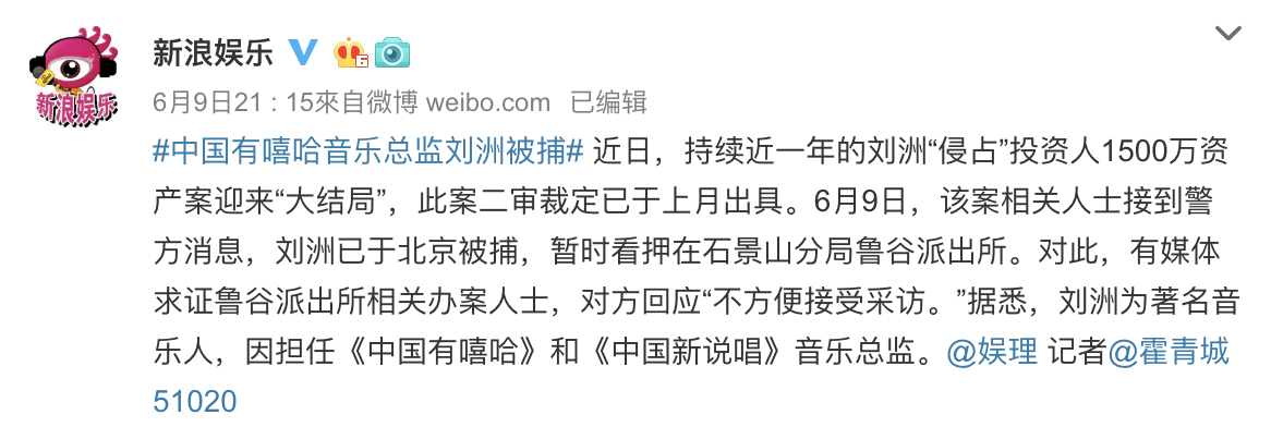 據陸媒《娛理》報導指出,劉洲在6月9日的17:35分在北京被逮捕,暫時被羈押在石景山分局魯谷派出所,他涉及侵占投資人1500萬(約台幣6800萬元),對方是黃子韜「龍韜娛樂」的合夥人張建華,一審被判處有期徒刑4年6個月,除了需歸還侵占的1500萬,還被處罰金人民幣50萬(約台幣230萬元),2019年2月22日,該案二審開庭,上個月此案迎來二審裁定,疑似維持一審原本的判決。