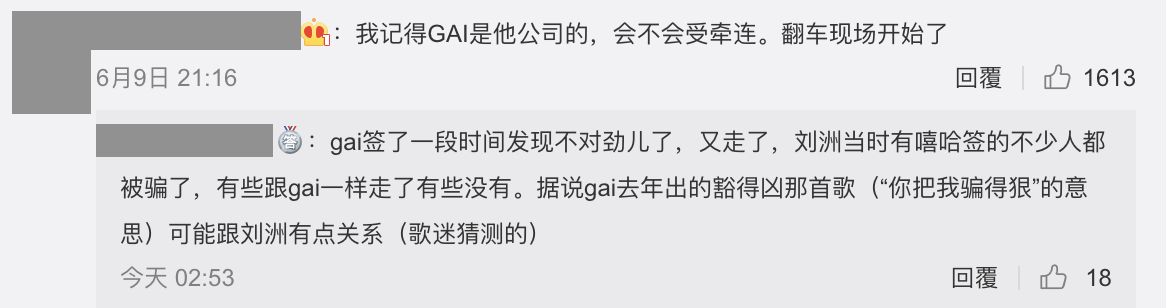 劉洲的公司旗下簽了許多嘻哈歌手,而當時劉洲簽下《中國有嘻哈》冠軍GAI時曾提到:「GAI在這個市場上,已經輸出了自己的一套生存之道」,而GAI也曾公開感謝過劉洲,如今劉洲被爆出涉嫌侵占1500萬人民幣,GAI也提前和他解約,不免讓網友將兩件事聯想在一起。