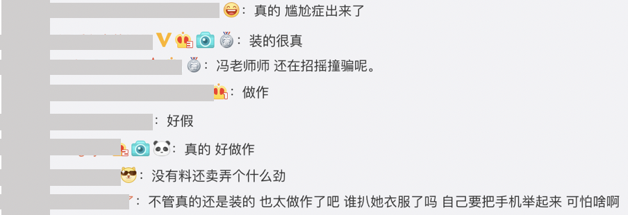 然而馮提莫險些走光的影片在微博上傳開後,許多網友紛紛認為馮提莫根本是在炒作,紛紛留言表示:「真的好做作」、「不管真的還是裝的 也太做作了吧 誰扒她衣服了嗎 自己要把手機舉起來 可怕啥啊」、「沒有料還賣弄個什麼勁」、「尷尬症出來了」、「裝的很真」,大家對於馮提莫險走光的舉動感到相當不滿,不斷留言抨擊。