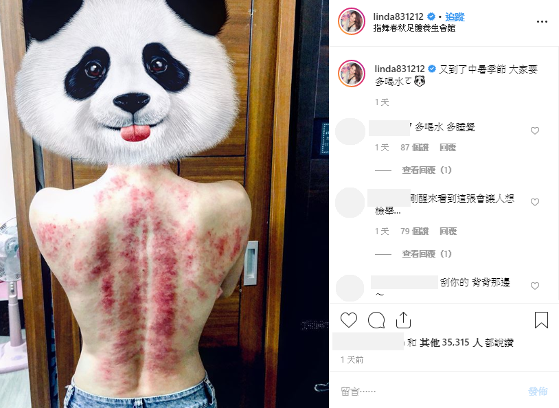琳妲9日在IG中打上:「又到了中暑季節 大家要多喝水ㄛ」,她也分享了刮痧的照片。只見照片中的她背部全裸,下身穿著牛仔褲,不過頭部則用一個熊貓圖案遮住。這張照片一眼看去便可看到大面積的紅印,從脊椎兩側到肩膀都一片通紅,雖然琳妲身形清瘦,背部線條也十分好看,不過刮痧的痕跡仍然讓許多網友相當震驚。