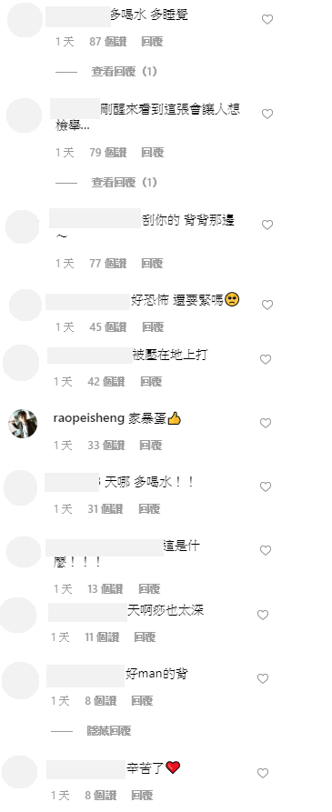 網友見狀也紛紛留言:「多喝水 多睡覺」、「剛醒來看到這張會讓人想檢舉…」、「刮你的 背背那邊~」、「好恐怖 還要緊嗎」、「被壓在地上打」、「天哪 多喝水!」、「這是什麼!!!」、「天啊痧也太深」、「也太恐怖了吧!0蛋多喝水休息喔」,培根也留言:「家暴蛋」。