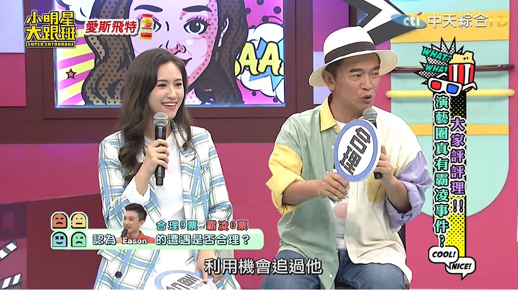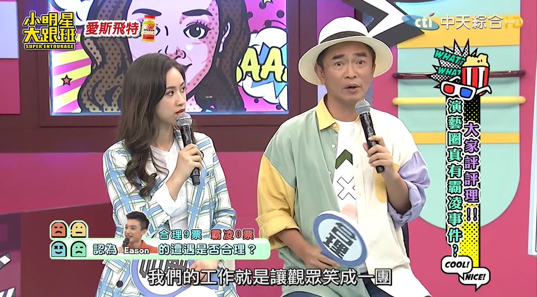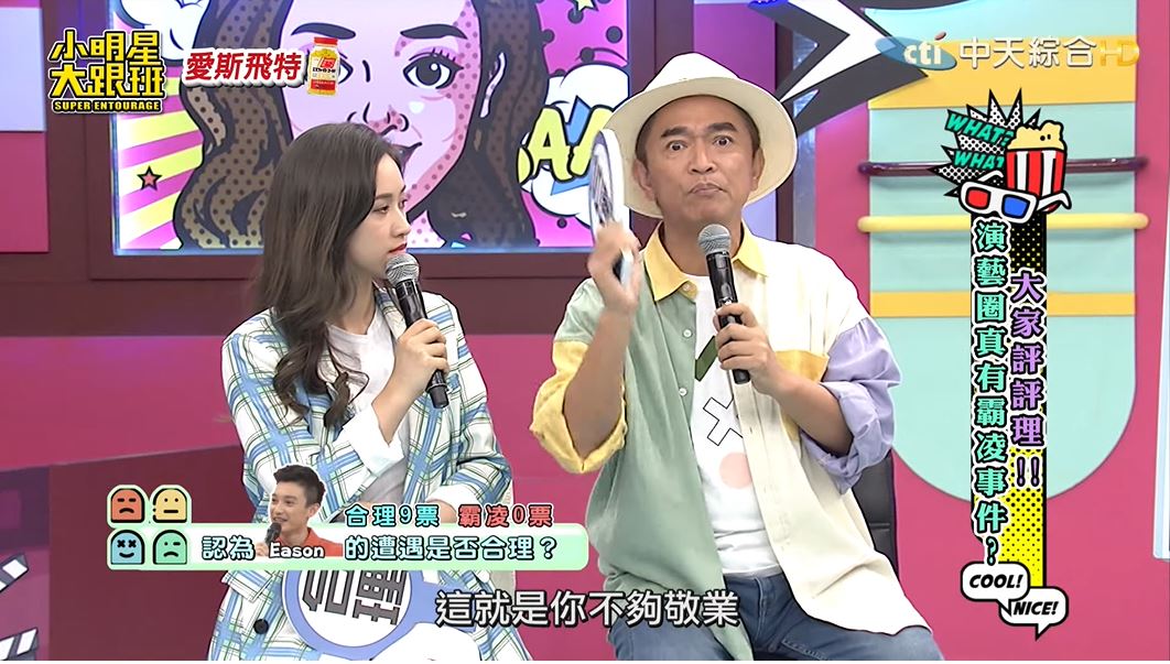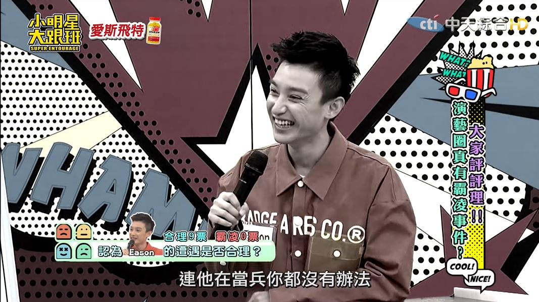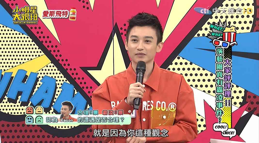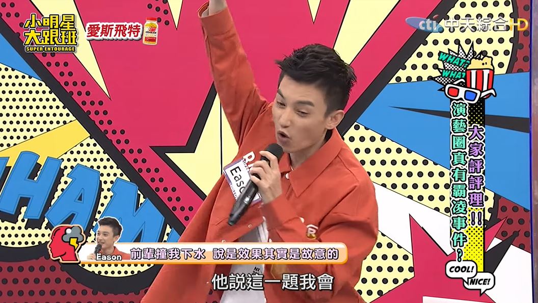 最後小鐘還直言:「就是有你這種觀念,所以你跟KID的那個距離等級越差越遠!」吳宗憲也說:「連他在當兵你都沒有辦法利用機會追過他!」就連包偉銘都覺得,如果今天換作是KID,他被推下水肯定會再自己跌進水裡一次。Eason原本想上節目抱怨,沒想到卻被前輩們訓了一頓,當場表情顯得有先尷尬,不過也直說自己真的學到了一課。