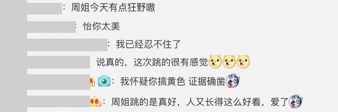 然而網友看見這則影片後,也紛紛留言大讚:「周姐跳的是真好,人又長得這麼好看,愛了」、「我懷疑你搞黃色,證據確鑿」、「說真的,這次跳的很有感覺」、「我已經忍不住了」、「怡你太美」、「周姐今天有點狂野」。除了影片之外,周淑怡也時常會在微博上發出一些直播截圖製作而成的GIF檔,相當沒有包袱的她都會出現很多表情,十分自然、可愛。
