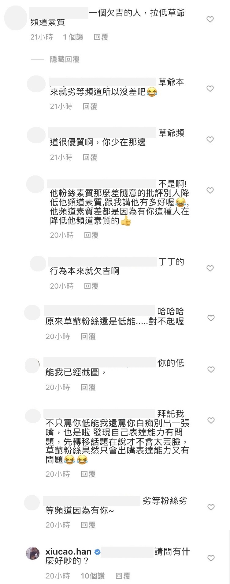 雙方你一句我一句吵得不可開交,頻頻爭論是粉絲拉低了草爺的頻道素質,最後也讓草爺看不下去,「請問有什麼好吵的?」,一句話讓酸民閉嘴,事實上該帳號也是假帳號,讓人看了十分無奈。
