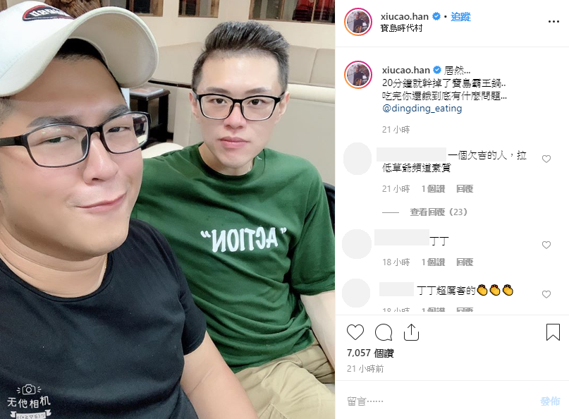 草爺昨9日貼上和丁丁的合照,打上:「居然...20分鐘就幹掉了寶島霸王鍋..吃完你還餓到底有什麼問題... 」,雖然是調侃對方,不過也看得出真的十分佩服對方的食量。怎料照片發布後,卻有網友留言:「一個欠吉的人,拉低草爺頻道素質」,後來又有網友回應:「草爺本來就劣等頻道所以沒差吧」。