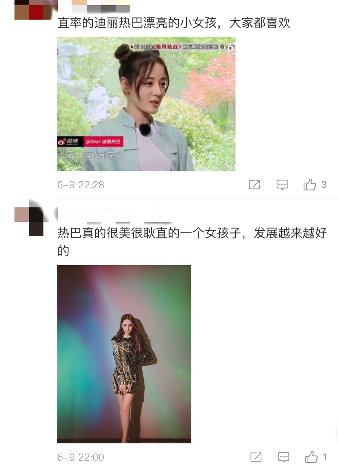 節目中參加面試的迪麗熱巴梳著哪吒頭,輪到她自我介紹時,她說道:「我叫迪麗熱巴,畢業於上海戲劇學院,身高1米69、體重47公斤」,說完後還轉了一圈,面試官看傻了眼並提出疑問,熱巴表示,「之前面試不都是轉一圈」。看到熱巴這可愛的模樣,網友紛紛留言表示,「直率的迪麗熱巴,漂亮的小女孩,大家都喜歡」、「熱巴真的很美很耿直的一個女孩子,發展越來越好的」。