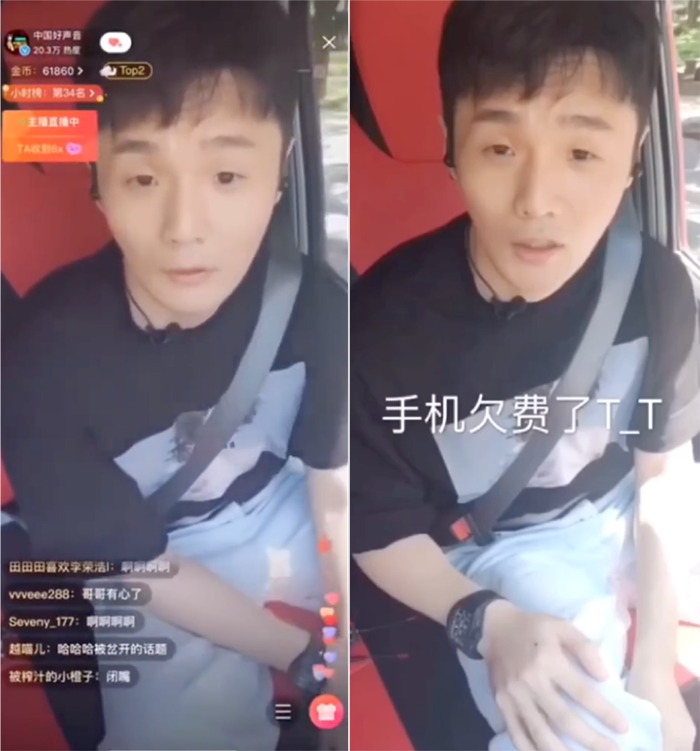 李榮浩近日宣布即將擔任節目《中國好聲音》的導師,然而他在前往北京的路上開始直播和粉絲們互動,但是卻在開播後沒有多久的時間後,李榮浩突然發現跳出一個「是否停止移動數據」的字樣,接著突然冒出了一句:「手機欠費了」,直播就瞬間結束了,因為手機的費用沒有繳納所以沒有網路的流量可以使用,李榮浩也被迫停止直播。