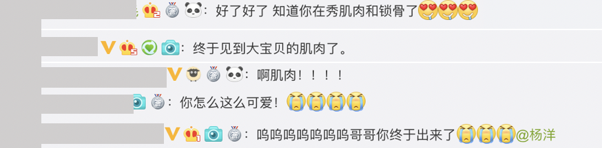 而網友們看見楊洋久違的曬照,紛紛激動的留言:「哥哥你終於出來了」、「你怎麼這麼可愛!」、「終於見到寶貝的大肌肉了」、「好了好了,知道你在秀肌肉和鎖骨了」,也有眼尖的粉絲發現楊洋的手指上有一些傷痕,希望他能夠好好注意安全,千萬別再受傷了:「手上的傷媽媽心疼」、「記得照顧好你自己」、「要保護好自己,不要受傷」。