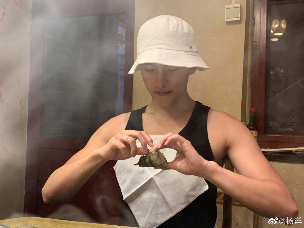 楊洋在6月7號時在微博上曬出一張照片,他頭上戴著一頂白色的漁夫帽,帽簷遮住了整個額頭,楊洋的視線也相當專注的看著手上的粽子,而他身上穿著一件黑色的背心吊嘎,在領口的地方塞入了一張紙巾,類似小時候穿著圍兜的樣子,十分可愛。而楊洋也因為穿著吊嘎的關係,露出了整隻手臂,他手臂的肌肉線條相當搶眼、非常壯碩,也讓粉絲們大飽眼福。