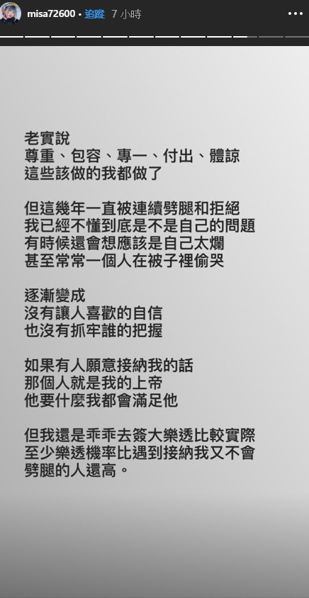 米砂今(11)日在IG限時動態中發文:「老實說,尊重、包容、專一、付出、體諒,這些該做的我都做了,但這幾年一直被連續劈腿和拒絕」,她無奈表示自己「已經不懂到底是不是自己的問題,有時候還會想應該是自己太爛,甚至常常一個人在被子裡偷哭」,坦言已經沒有讓人喜歡的自信,也沒有抓牢誰的把握。