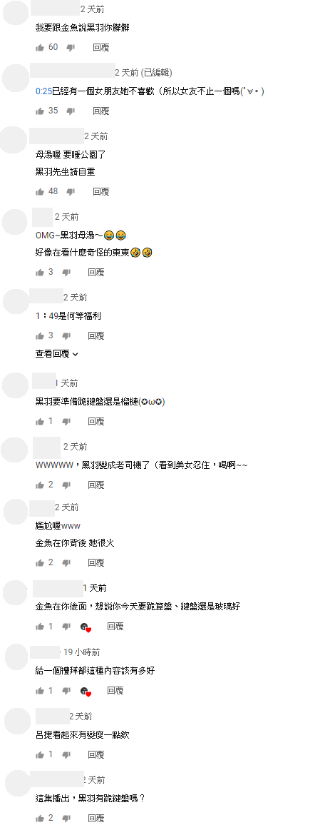 影片上傳之後,因為兩個女生戲水的畫面太過惹火,許多網友看了也紛紛留言:「我要跟金魚說黑羽你髒髒」、「母湯喔 要睡公園了 黑羽先生請自重」、「OMG~黑羽母湯~ 好像在看什麼奇怪的東東」、「黑羽要準備跪鍵盤還是榴槤」、「金魚在你背後 她很火」。