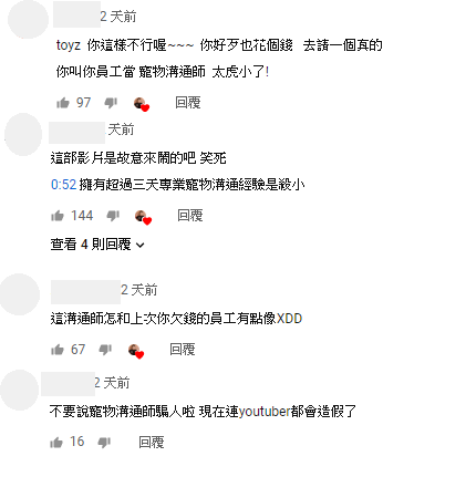 最後Toyz說這部影片並沒有要Diss任何寵物溝通師的意思,希望大家不要因此覺得這個行業都在騙人,至於願不願意相信就見仁見智了!不過影片播出之後,反而有許多網友討論這部影片疑似造假,「你這樣不行喔~~~ 你好歹也花個錢 去請一個真的 你叫你員工當 寵物溝通師 太唬X了!」、「不要說寵物溝通師騙人啦 現在連youtuber都會造假了」、「這溝通師怎和上次你欠錢的員工有點像XDD」,指出影片溝通師疑似根本是他的員工,不過Toyz則沒有回應,讓人霧裡看花。