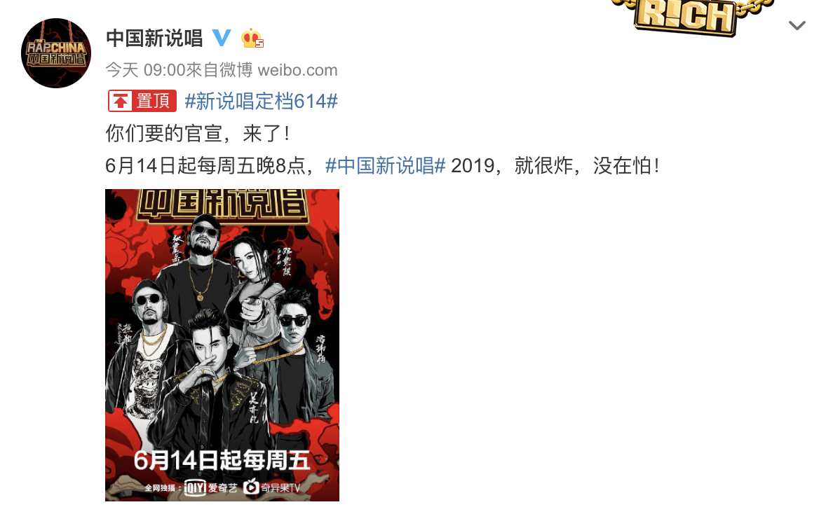 從2017年的《中國有嘻哈》一直到《中國新說唱》不論在收視率或是討論熱度上都繳出相當優異的成績,然而《中國新說唱》第二季在4月中時也正式宣布導師名單將是原班人馬回歸,並將鄧紫棋與潘瑋柏拆團,各自成立一支隊伍。然而大家相當關注的都是節目到底什麼時候才會播出,過去也時常看見網友在官方微博下留言詢問,官方在今日(12號)發文寫下:「你們要的官宣,來了!6月14日起每週五晚8點,#中國新說唱# 2019,就很炸,沒在怕!」,正式於本週五開播。