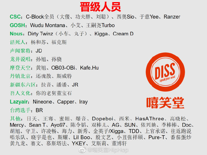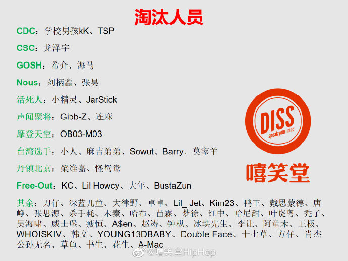 日前在4月底時,《中國新說唱》官方公佈了一些選手名單,然而知名嘻哈博主更在微博上整理出所有晉級以及被淘汰的名單,在官方公佈在體育館內入選的名單僅有33位,其中包含:麻吉弟弟、Barry Chen、黃旭、功夫胖、葉子銘等人。然而嘻哈專業博主也整理出名單,其中台灣選手中只有「BR」成功從MC Hotdog熱狗手中取得金項鍊進入第二輪,如今節目即將播出,也讓人相當期待選手們的表現。