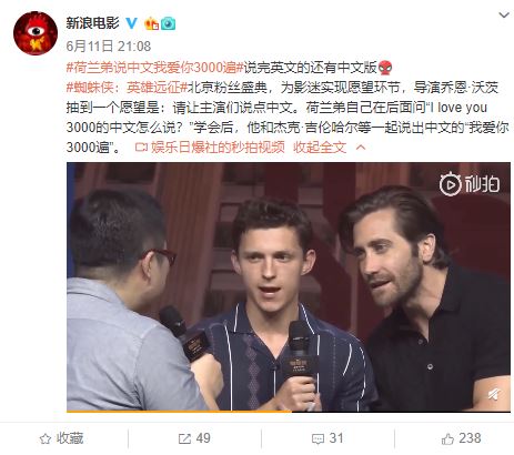 除了演員群私人行程外,在公開見面會中,被台下粉絲要求說文,而湯姆霍蘭德就主動詢問「終局之戰」中的經典台詞「我愛你3000遍」中文說法,在主持人字句教導下,湯姆霍蘭德和傑克葛倫霍一起對台下粉絲告白,讓現場粉絲和網友都陷入瘋狂回應「愛你不只3千遍啊」。