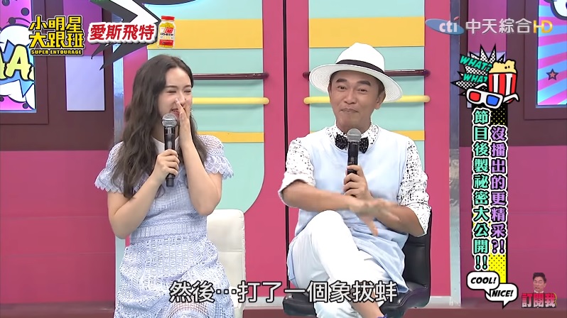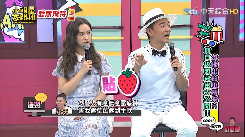 許多女藝人上綜藝節目,為了要取得團隊勝利,遊戲中不小心走光、被扯下衣服,種種事件頻傳,「綜藝天王」吳宗憲與Sadny主持節目《小明星大跟班》中,近日公開節目後製秘密,其中後製「小天」透露有些女藝人坐高腳椅翹腳,頻頻露出小內褲,「不知道她是故意還是怎樣?」吳宗憲則講到後製「貼草莓」的由來,並表示藝人小甜甜上《綜藝玩很大》時,不小心走光,居然被後製貼上「象拔蚌」的外型,讓憲哥看了直說:「現在是有病喔!」