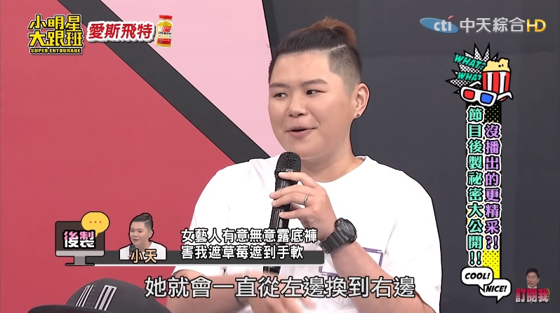 《小明星大跟班》節目討論內容包羅萬象,近日討論話題為「沒播出的更精彩?!節目後製秘密大公開!」節目來賓找來許多製作人與後製人員,其中一位後製「小天」,入行五年,工作內容是看帶與剪接,她在節目中透露,有些女藝人坐高腳椅都會翹腳,由於穿得褲子太短,會不小心露出內褲,讓她疑惑表示:「不知道她是故意還是怎樣,就會一直從左邊換到右邊…想說這些女藝人可以好好坐著嗎?」