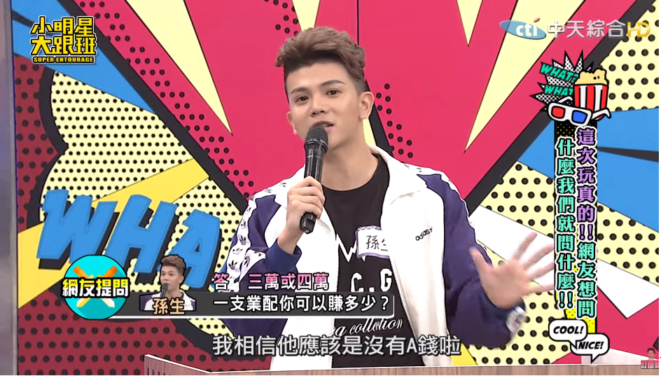 另一方面,這次也有網友詢問孫生業配的價碼,不過孫生則表示自己演一支業配影片都只能拿到3、4萬,「我是拿演員費而已」,現場來賓則說明按理來說粉絲團有多少粉絲,業配價碼就會高達多少,不過孫生則強調財務方面都是酷炫處理,自己就是拿演員費,「我相信他應該沒有A錢啦」。