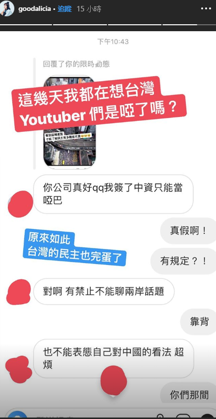 愛莉莎莎貼上自己和別的網紅的對話,只見對方回應她聲援香港的動態:「妳公司真好QQ,我簽了中資只能當啞巴」,愛莉莎莎則相當震驚詢問:「真假啊?有規定?」,對方則繼續說明,「對啊,有禁止不能聊兩岸話題,也不能表態自己對中國的看法,超煩」。