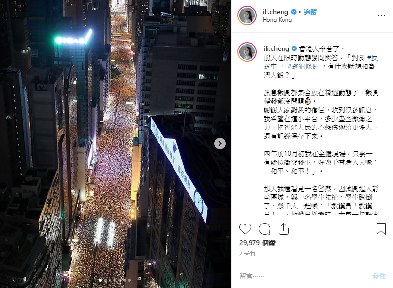近日香港超過百萬人上街遊行反對《逃犯條例》(送中條例),現在更有許多民間團體發起罷課、罷工,希望政府可以撤回修例。事情爆出之後,引起國際關注,尤其香港和台灣在歷史上的脈絡相似,「今日香港明日台灣」的議題也在網上瘋傳,成為大家最關注的議題之一。愛莉莎莎近日也在IG中發布自己在香港的照片聲援,沒想到竟有別的網紅表示因為簽了中資而無法發聲。