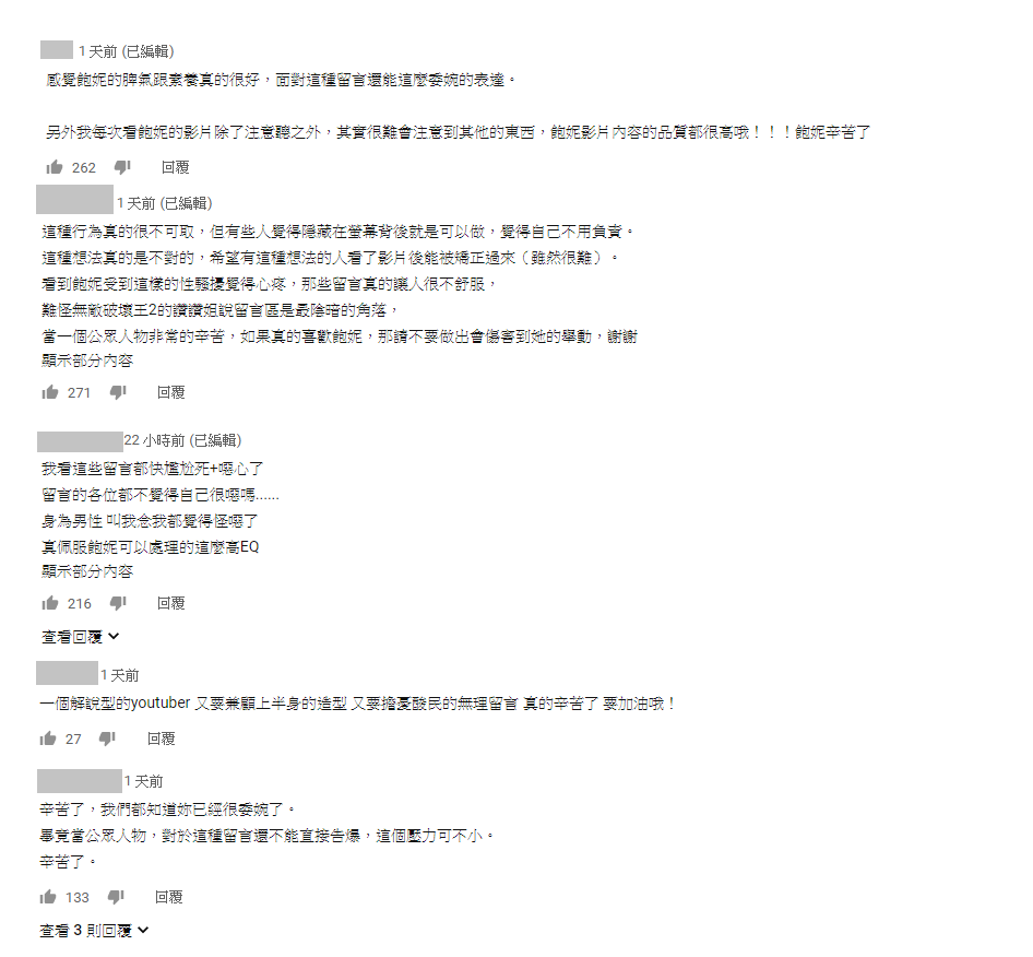 儘管在影片中,「飽妮」以十分委婉的方式揭露了這些訊息,但這仍讓許多喜愛「飽妮」的粉絲感到心疼,紛紛留言表示「我看這些留言都快尷尬死+噁心了」「這種行為真的很不可取」「真的辛苦了 要加油哦!」「辛苦了,我們都知道妳已經很委婉了。」。