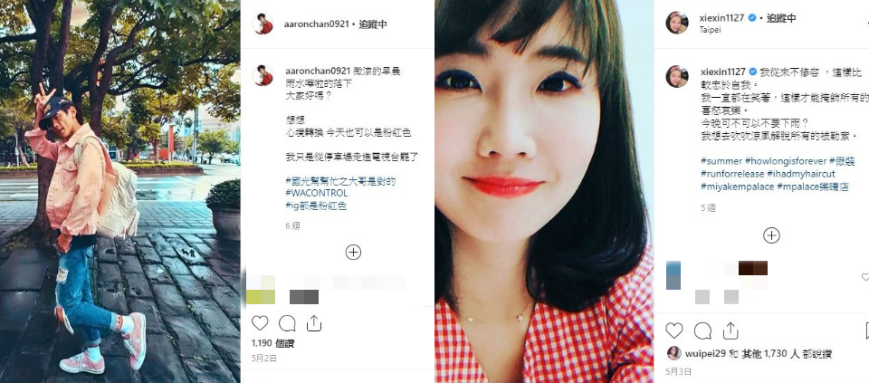 5月2日阿翔在發文寫著:「微涼的早晨,雨水嘩啦的落下,大家好嗎?想想心境轉換,今天也可以是粉紅色。」而謝忻隔天就在IG貼出自己的自拍照,表示自己從來不修容,因為這樣比較能忠於自我,「我一直都在笑著,這樣才能掩飾所有的喜怒哀樂。今晚可不可以不要下雨?我想去吹吹涼風解脫所有的被勒索。」