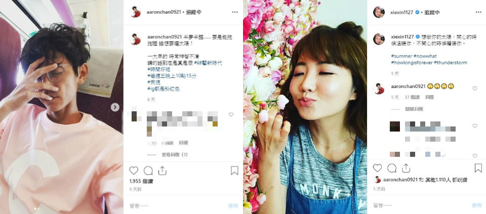 6天前,阿翔在IG發文寫著:「半夢半醒…要是能抱抱睡誰想要曬太陽!一大早的,時常神智不清,講的話到底是真是假,我可是都當真囉!!!!」就這麼巧,謝忻隔天也放上嘟嘴親吻的照片,曖昧寫著:「想做你的太陽,開心的時候溫暖你,不開心的時候曬傷你。」兩個人都用「太陽」當作隔空傳情的暗號,如今戀情爆發,讓網友們都看不下去。