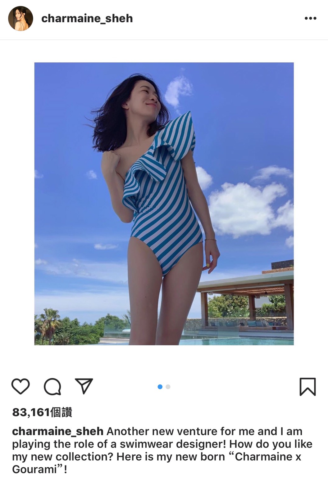近日,為了自己設計的泳裝,罕見的在社群軟體上曬出泳裝照,畫面中,由下往上拍的角度讓整體視覺更顯纖細,一雙修長美腿配上纖細的小蠻腰,完美展現出身材好比例,單邊無袖設計,大方露出性感鎖骨,斜條紋帶有花邊感的泳衣更顯現出可愛,臉上幾乎看不出任何妝容,皮膚保養得宜。
